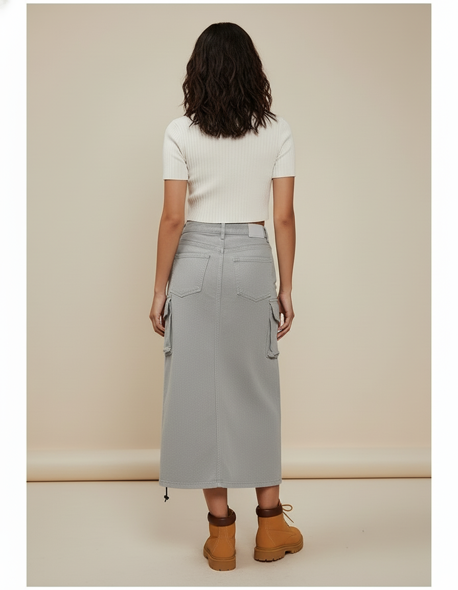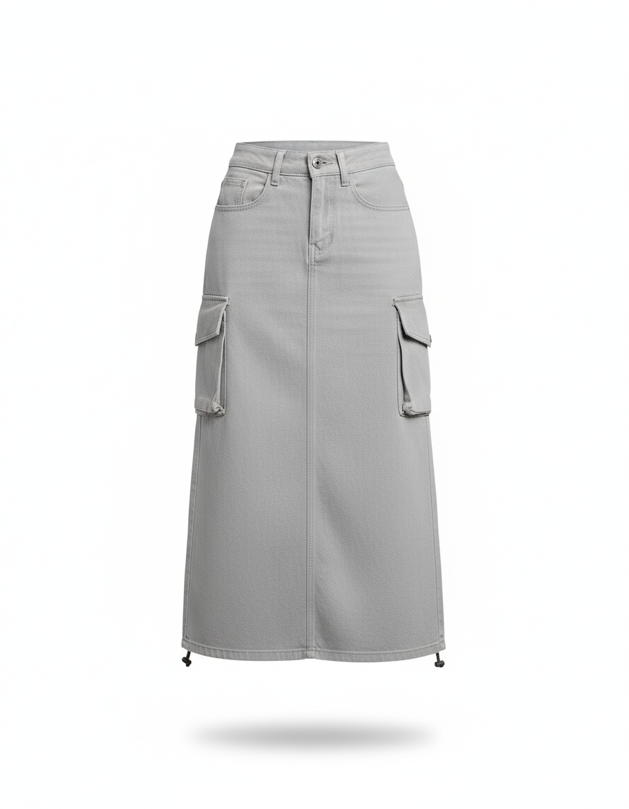 Adoptez un style décontracté et branché avec notre jupe longue en jean cargo grise.