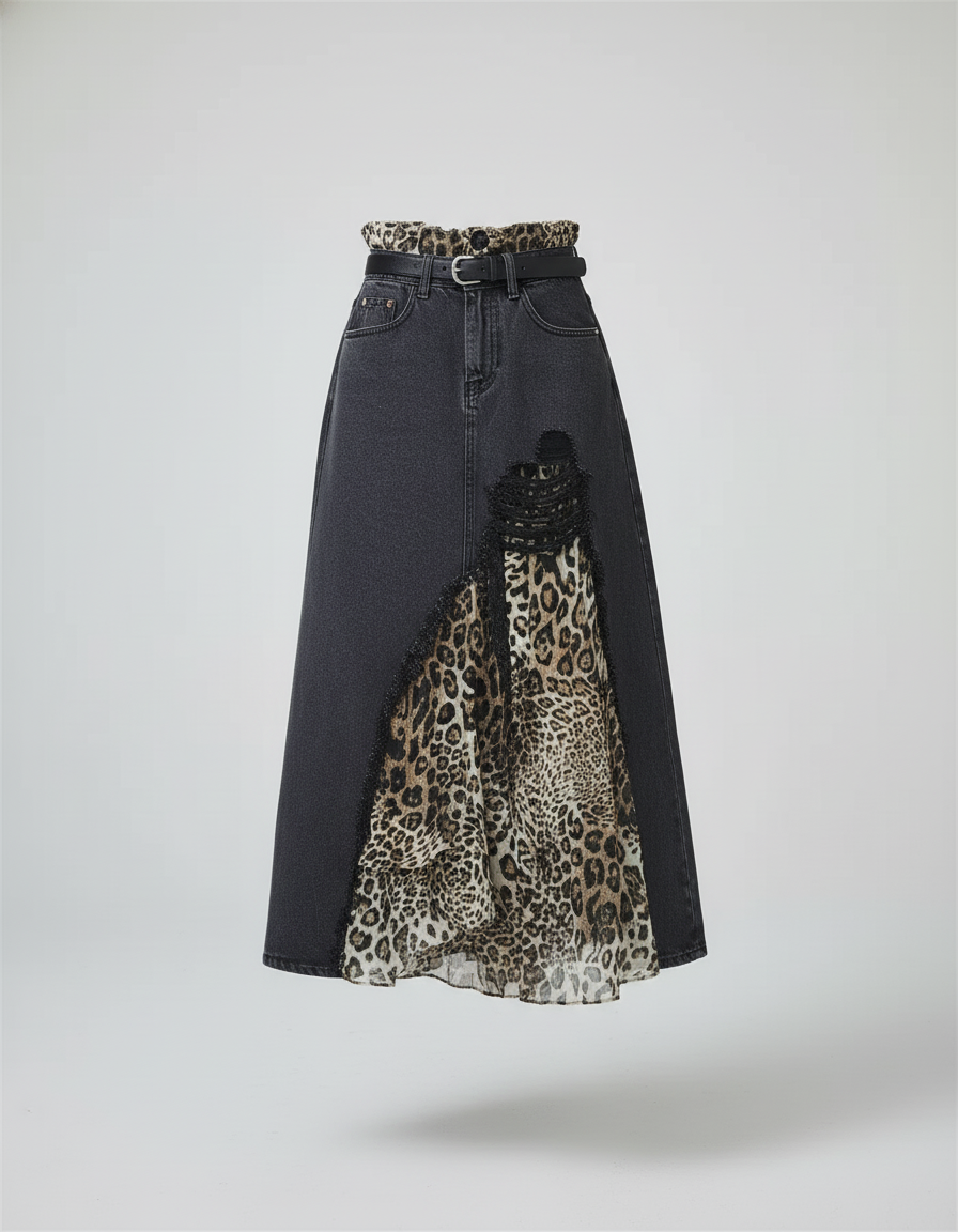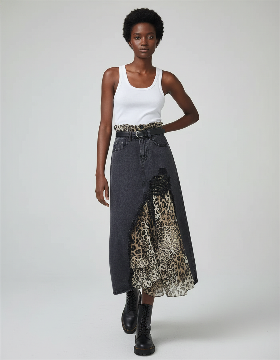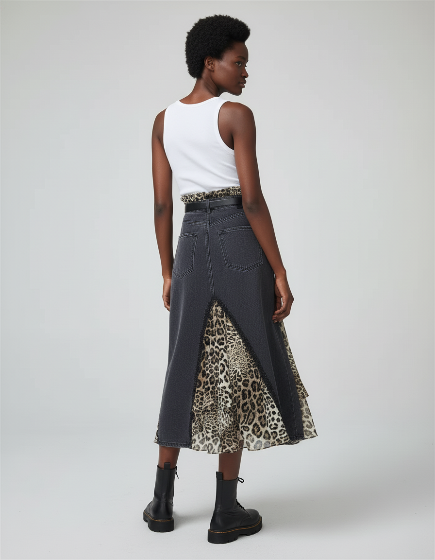 Ce qui la distingue ? Une fusion audacieuse de textures et de motifs. Le denim gris délavé, d'une qualité irréprochable, contraste superbement avec un patchwork léopard asymétrique, ajoutant une profondeur visuelle et un mouvement fluide à chaque pas. Chaque détail est pensé pour créer une silhouette contemporaine et mémorable. Portez-la avec des bottes robustes pour un look urbain affirmé ou des talons délicats pour une touche glamour. Une pièce véritablement incomparable, synonyme de luxe et d'originalité.