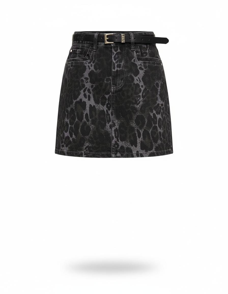 Adoptez un style audacieux et tendance avec notre jupe en jean imprimé léopard, parfaite pour toutes les occasions.