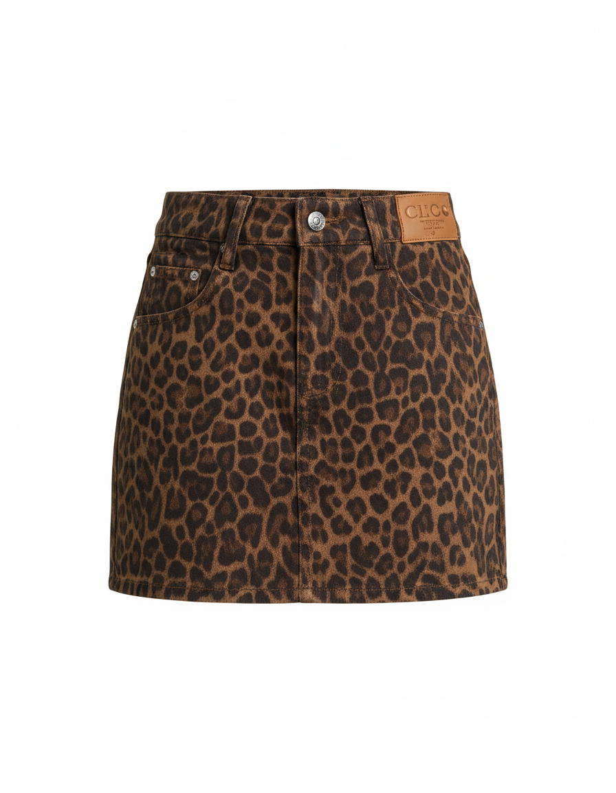 Adoptez un look audacieux et tendance avec notre jupe en jean mini à imprimé léopard.