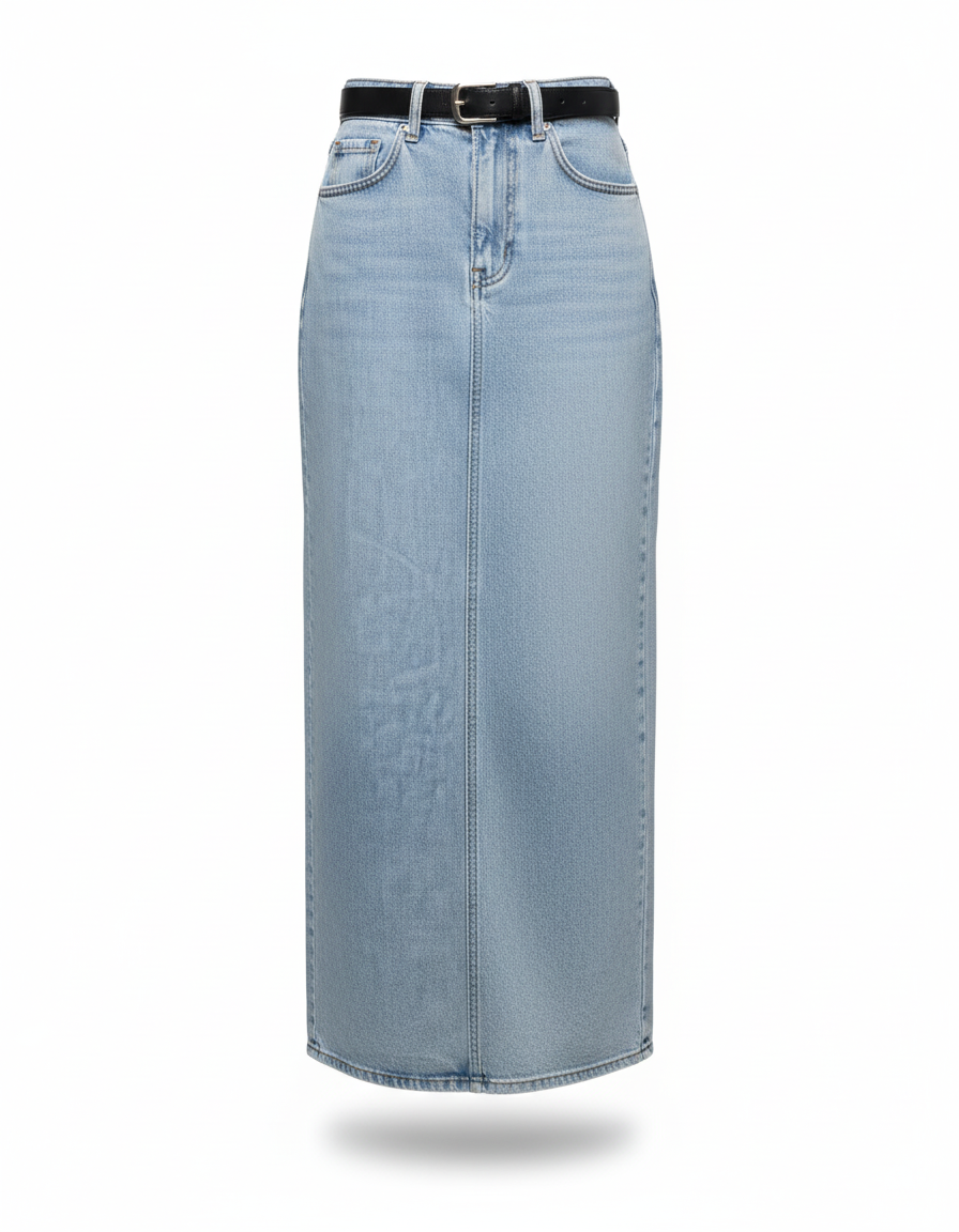 Cette jupe en jean longue présente une fente haute sur le côté. Elle est confectionnée en denim de couleur bleu clair délavé avec une coupe droite.