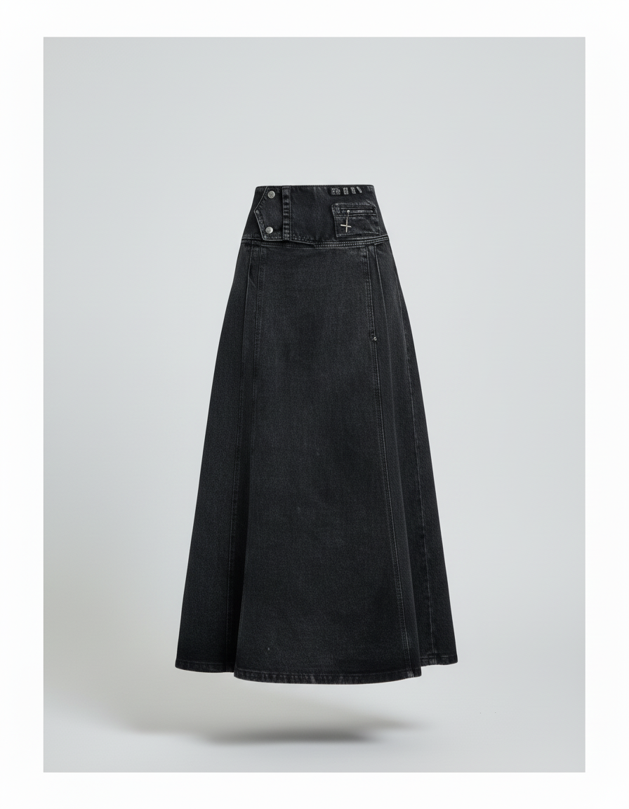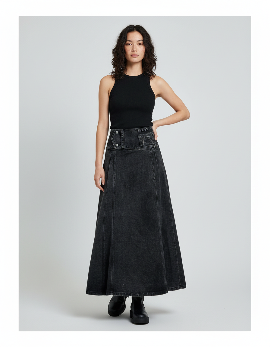 L'Essence du Chic Moderne : La Jupe Jean Longue Noire Délavée Fluide