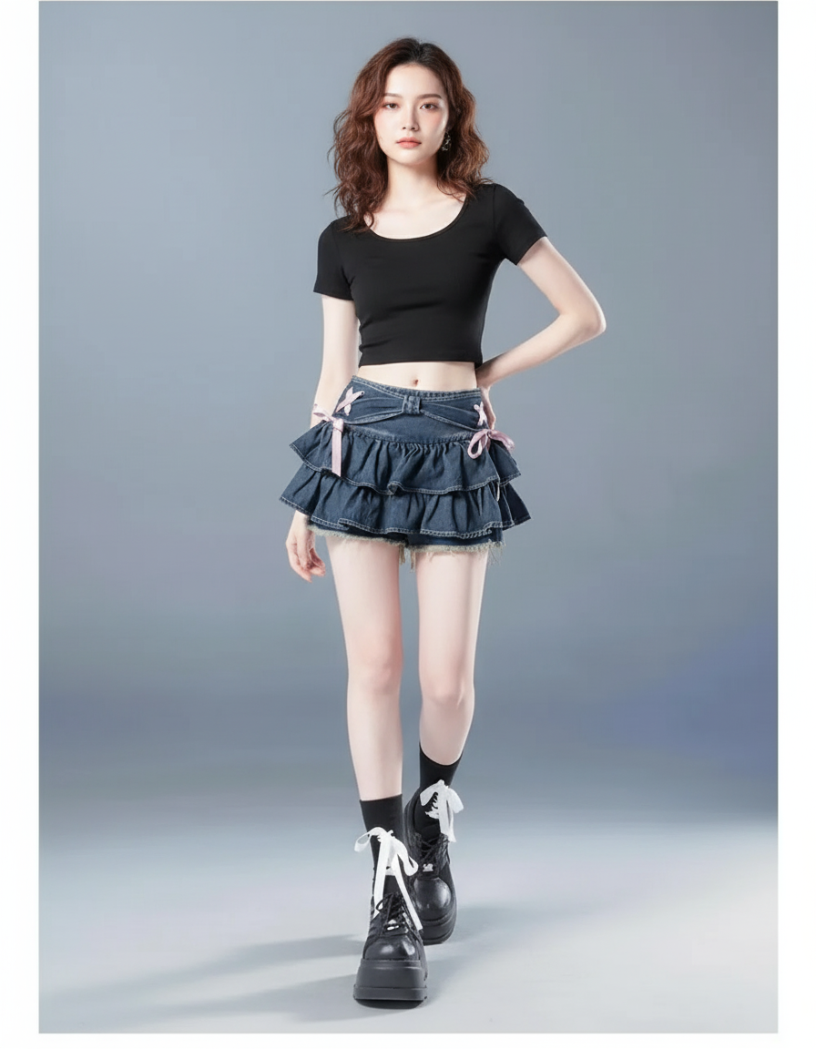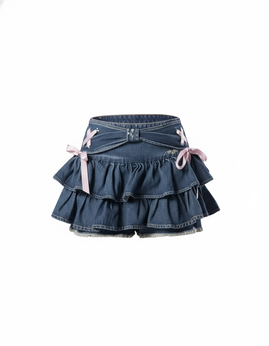 Cette jupe est une mini-jupe en jean de couleur denim foncé, caractérisée par des volants étagés et des détails de nœuds décoratifs roses.