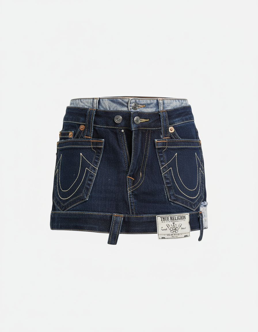 Cette jupe en jean est une mini-jupe fabriquée à partir de denim, présentant une coupe courte et un assemblage de panneaux.