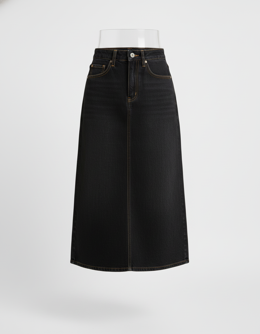 Adoptez un style intemporel avec notre jupe en jean noir taille haute, un indispensable de votre garde-robe.