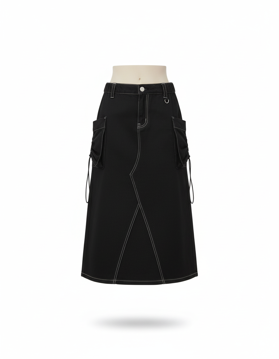 Jupe Jean Noire Cargo Décontractée Stylée avec Coutures Contrastées
