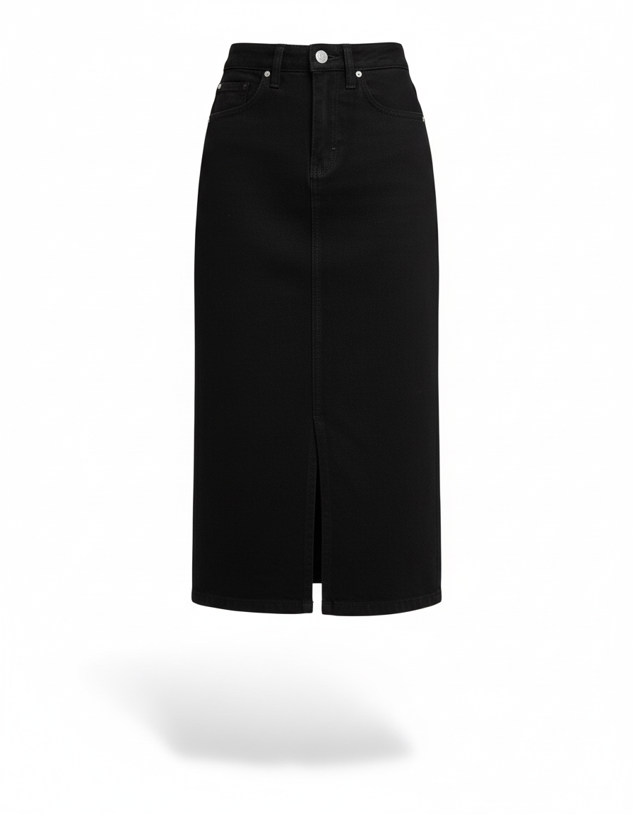 Cette jupe est un modèle en jean noir. Elle présente une coupe droite, une longueur midi et une fente frontale.