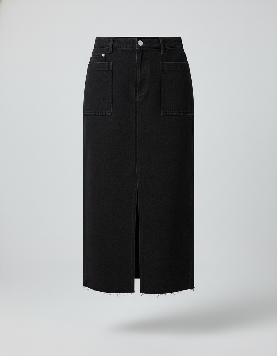 Découvrez notre jupe en jean noire fendue, la pièce idéale pour une allure chic et contemporaine.