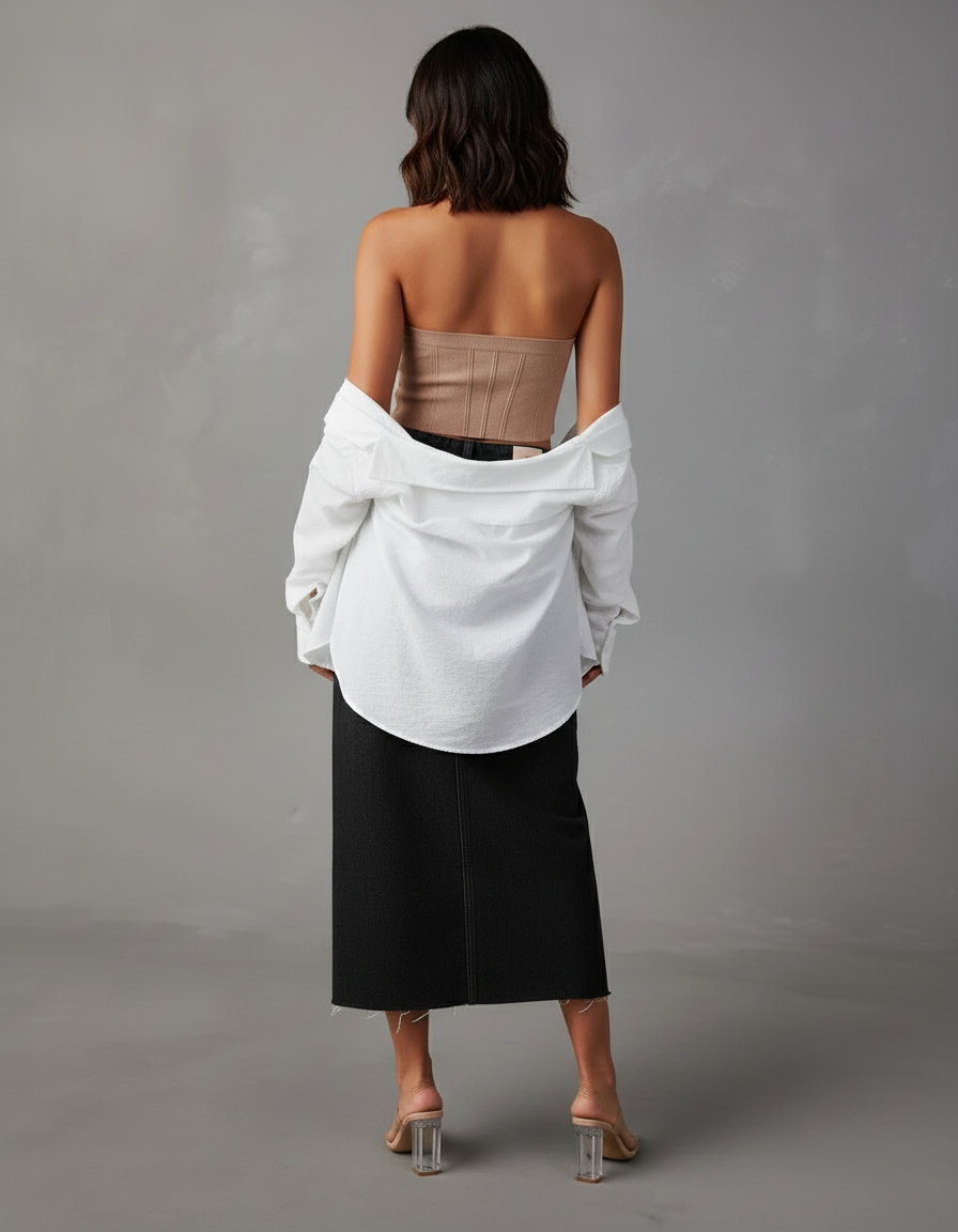 Élevez votre style quotidien avec notre Jupe Jean Noire Fendue Vintage, une pièce maîtresse qui allie audace et raffinement. Son denim noir profond et sa fente avant subtile en font le choix idéal pour une multitude d'occasions. Pour un look décontracté chic, associez-la à un crop top en maille et des sandales minimalistes, comme le suggère notre stylisme. Pour une soirée élégante, transformez-la avec une blouse fluide en soie, des talons aiguilles et des accessoires dorés. C'est la base parfaite pour exprimer votre personnalité, du brunch entre amis à une sortie citadine branchée.