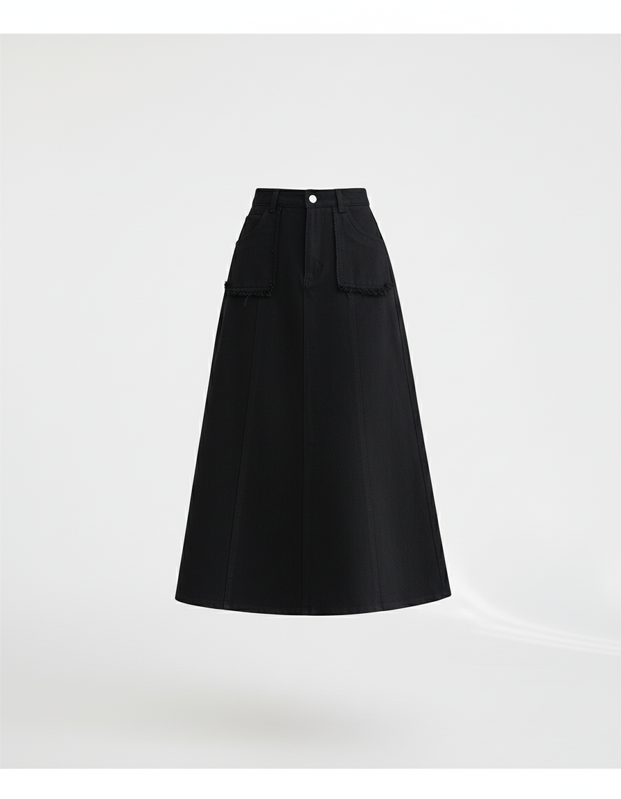 Cette jupe jean noire frangée taille haute chic présente une coupe évasée et une longueur midi. Elle est dotée de poches plaquées à l'avant avec des bords effilochés.