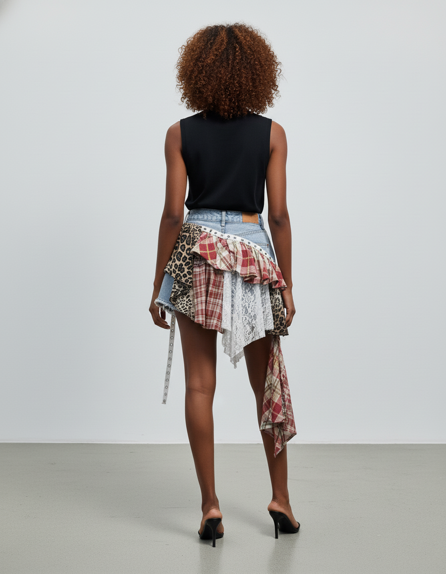 Fruit d'une conception innovante, cette jupe se distingue par son assemblage audacieux de textures et de motifs. Le denim brut rencontre l'exubérance du léopard, la délicatesse de la dentelle et le charme intemporel du carreau écossais, dans une symphonie de volants et de détails inattendus. Chaque patchwork est méticuleusement agencé pour créer une silhouette dynamique et résolument contemporaine. C'est l'essence même du luxe décontracté, une œuvre d'art portable qui transforme chaque sortie en défilé.