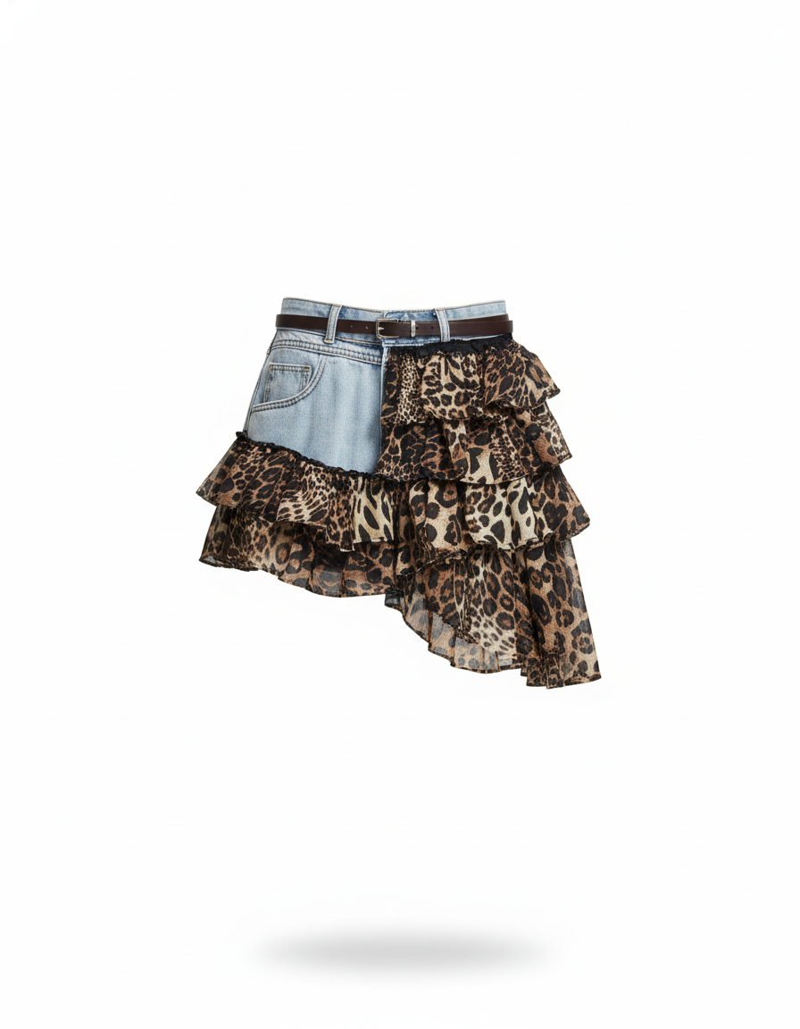 L'Élégance Sauvage Rencontre le Chic Urbain : Jupe Jean Patchwork Léopard Fluide