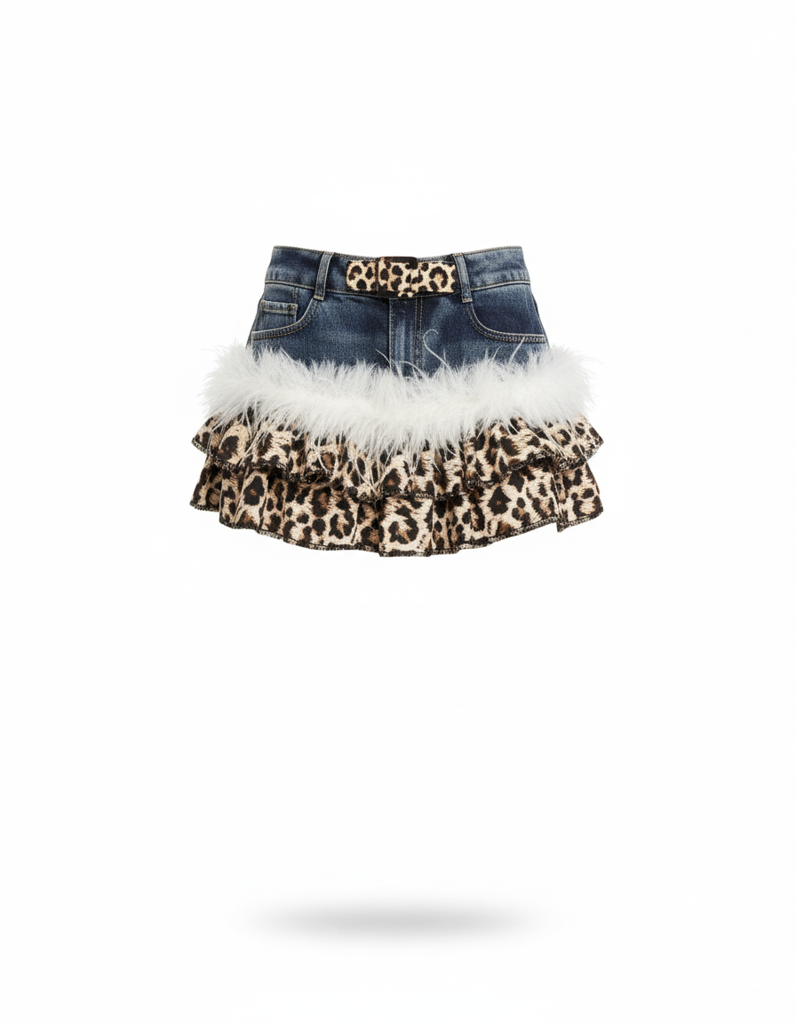 Cette jupe est une mini-jupe en jean. Elle présente des empiècements en tissu imprimé léopard et une garniture en plumes blanches.