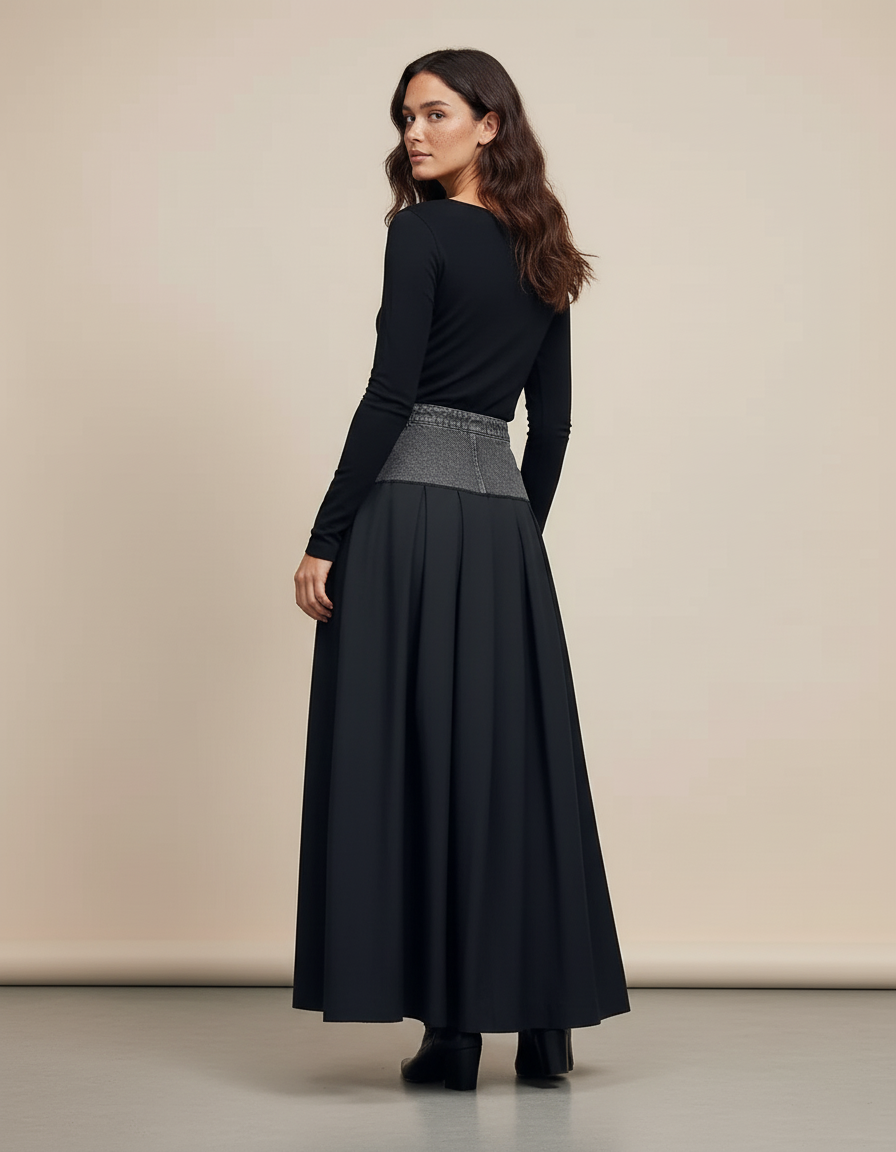 Révolutionnez votre garde-robe avec la Jupe Jean Patchwork Plissée Chic, une pièce maîtresse qui incarne l'alliance parfaite entre audace moderne et sophistication intemporelle. Conçue pour la femme qui ose affirmer son style, cette jupe offre une silhouette majestueuse et une allure distinguée. Le patchwork en jean gris texturé, méticuleusement intégré au niveau de la taille, apporte une touche urbaine et contemporaine, contrastant harmonieusement avec la fluidité et le mouvement élégant des plis infinis. C'est la jupe idéale pour celles qui recherchent une pièce unique, capable de transcender les occasions, du bureau au dîner chic, en passant par les événements décontractés mais stylés.