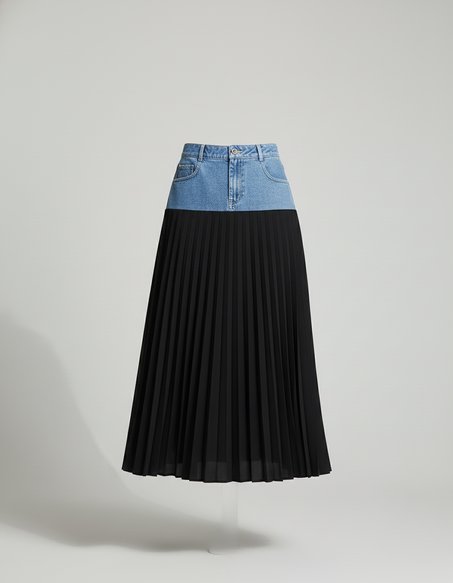 Jupe Jean Patchwork Plissée Longue : Design Bicolore