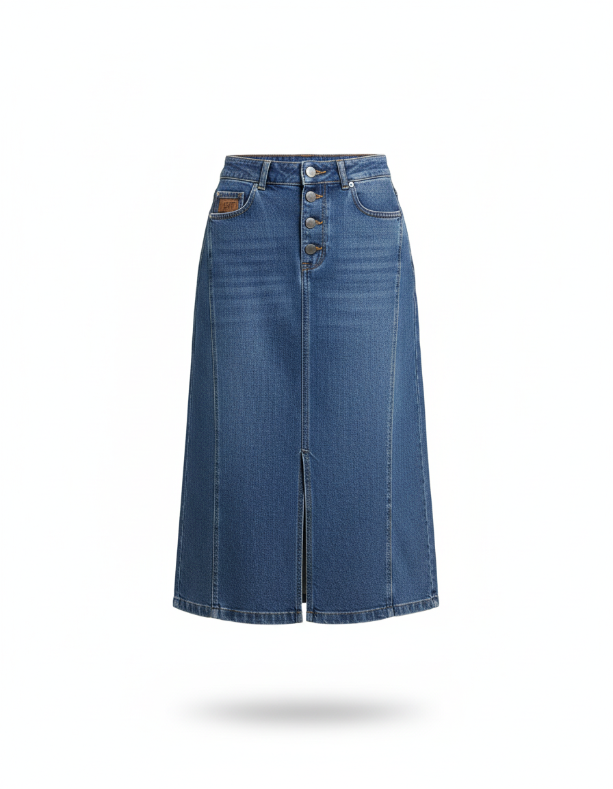 Bien plus qu'une simple jupe en jean, c'est une pièce de design pensée pour durer et impressionner. La qualité de son denim et sa finition impeccable, notamment sa patte de boutonnage apparente, la distinguent clairement. Portez-la avec un chemisier fluide pour une allure professionnelle ou avec un t-shirt en coton pour un style décontracté et raffiné. Cette jupe est la promesse d'une garde-robe capsule intelligente, où chaque vêtement est choisi pour sa polyvalence et son pouvoir d'élégance. Adoptez-la et incarnez la modernité avec une touche de chic intemporel.