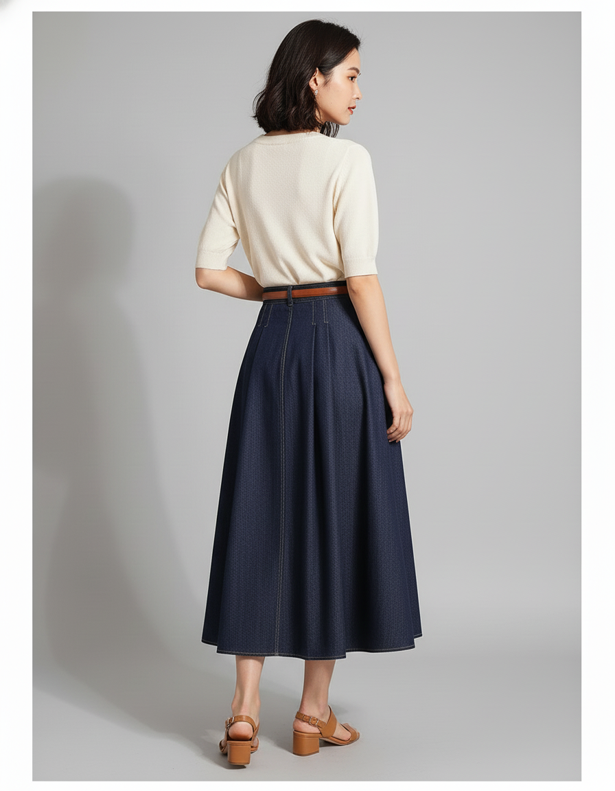 Ce qui distingue cette jupe, c'est son mariage unique entre la robustesse classique du denim et l'art raffiné d'un plissé précis. La teinte indigo profond et non lavée offre une richesse visuelle qui évoluera magnifiquement avec le temps, racontant votre histoire unique. Plus qu'une simple jupe, c'est un investissement dans un style durable, offrant un confort inégalé et un caractère distinctif qui rehausse n'importe quelle tenue. Associez-la à un tricot délicat ou une blouse épurée pour un look naturellement sophistiqué.