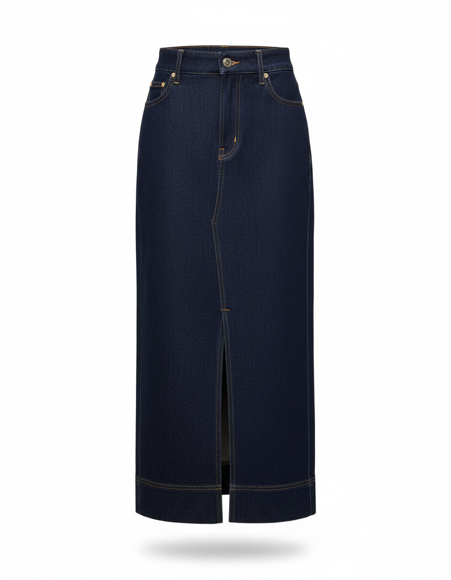 Confectionnée dans un denim premium, cette jupe offre un tombé impeccable qui flatte toutes les silhouettes. La fente arrière stratégiquement placée n'est pas seulement un détail stylistique ; elle assure une liberté de mouvement optimale, vous permettant de marcher, de vous asseoir et de vivre votre journée sans aucune contrainte. Oubliez les jupes longues rigides : la nôtre est pensée pour accompagner chacun de vos pas avec fluidité et aisance, tout en conservant une tenue parfaite et une allure sophistiquée du matin au soir.