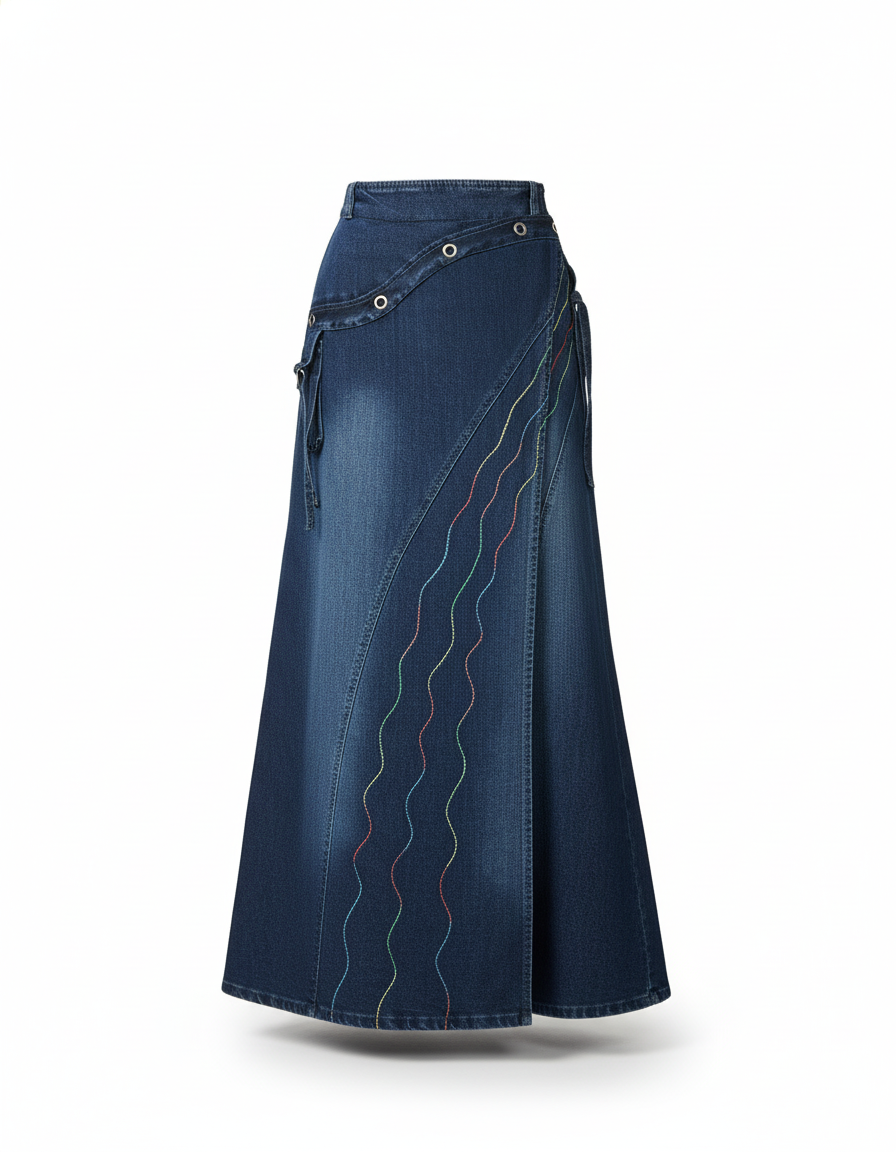 Notre Jupe Longue En Jean Hiver réinvente la silhouette décontractée avec une touche d'audace. Confectionnée dans un denim bleu foncé de qualité supérieure, sa coupe portefeuille flatteuse s'adapte à toutes les morphologies, offrant une élégance naturelle. Les motifs texturés brodés, des vagues multicolores délicates, apportent une note artistique et singulière, transformant ce basique en pièce maîtresse de votre garde-robe quotidienne. Chaque détail est pensé pour refléter l'excellence et l'originalité de notre marque.