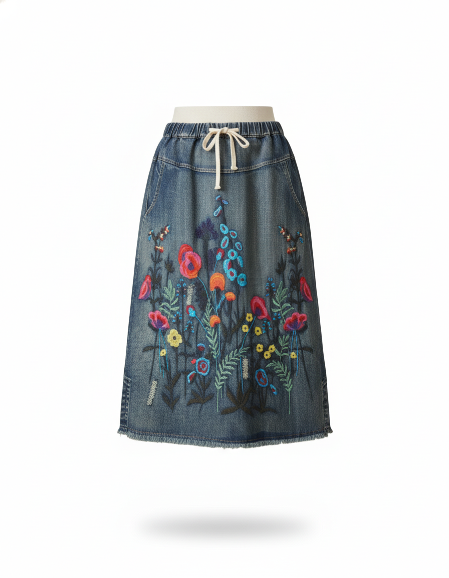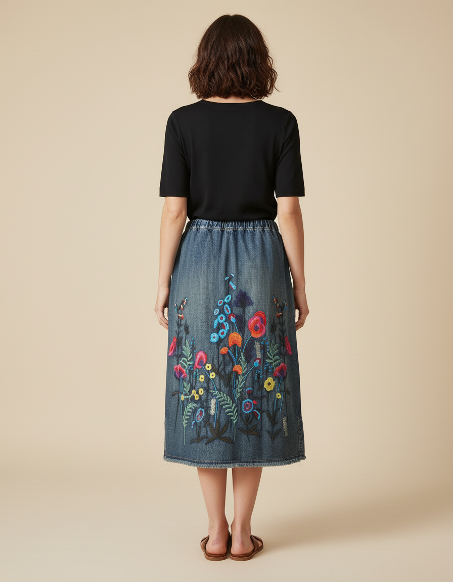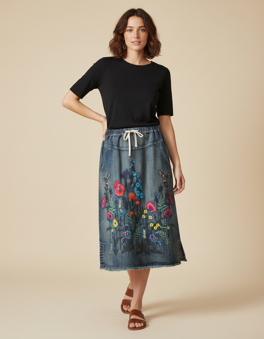 Adoptez un style bohème et décontracté avec notre jupe mi-longue en jean, ornée de broderies florales vibrantes.