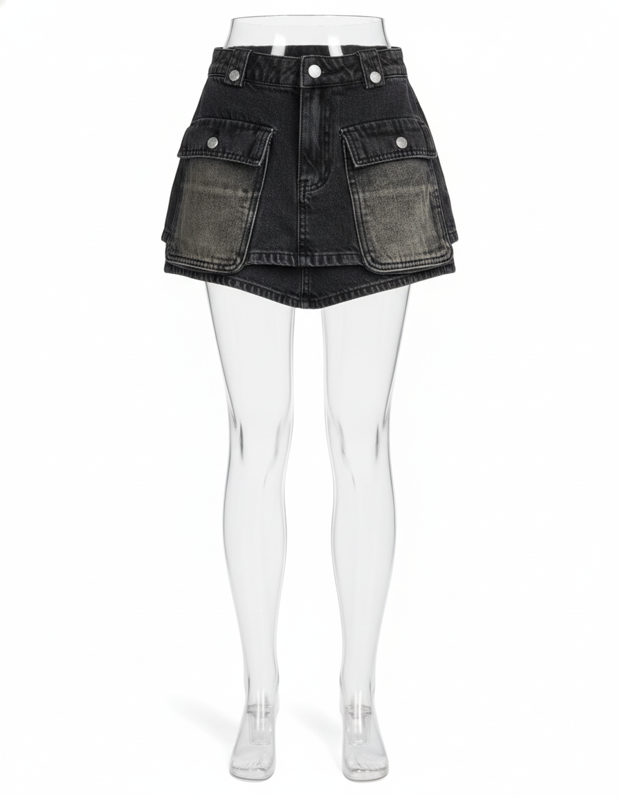 Adoptez un style audacieux et pratique avec notre jupe short en jean délavé, idéale pour toutes vos aventures.
