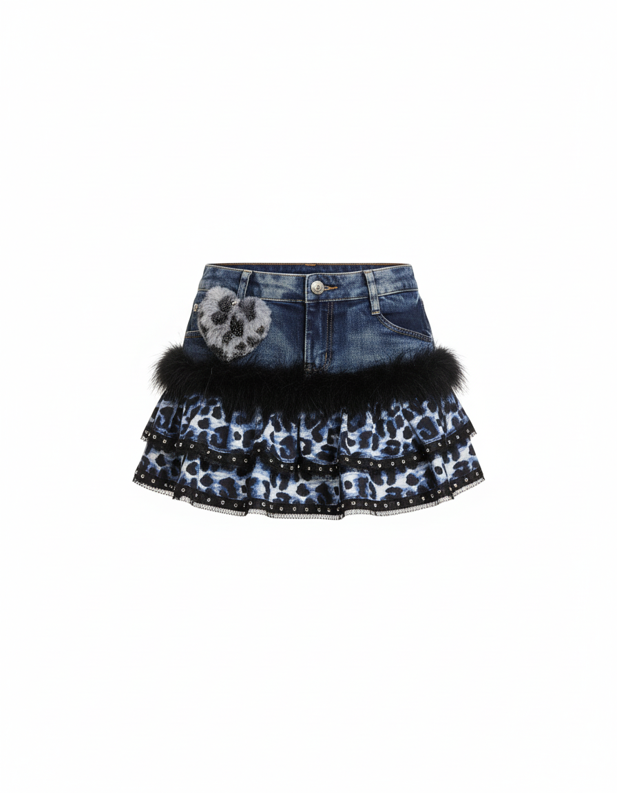 Cette jupe courte en jean présente une section inférieure à volants avec un motif léopard et une bordure en fausse fourrure noire. La partie supérieure est en denim de couleur foncée.