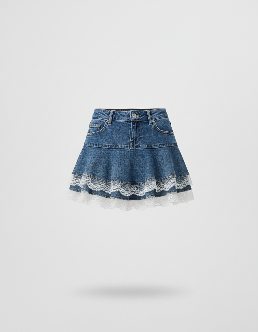 Jupe Short En Jeans à volants et dentelle